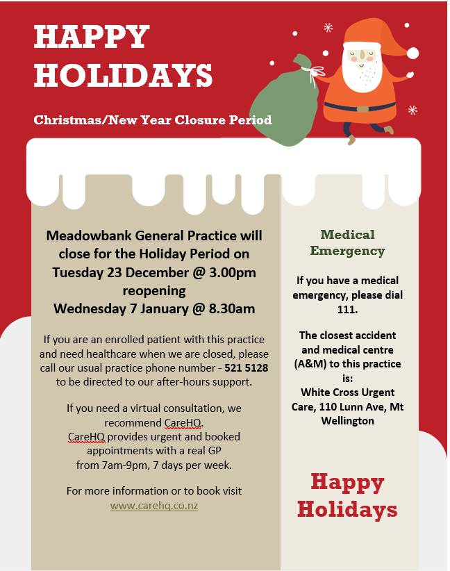 Meadowbank General Practice will close for the holiday period on